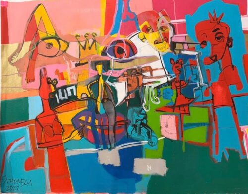 Working primarily on large canvases, her process integrates a wide range of materials including acrylic, oil, charcoal, watercolor, markers, and recycled organic components. Through this layered methodology, her works explore the relationship between material, memory, and the human figure.