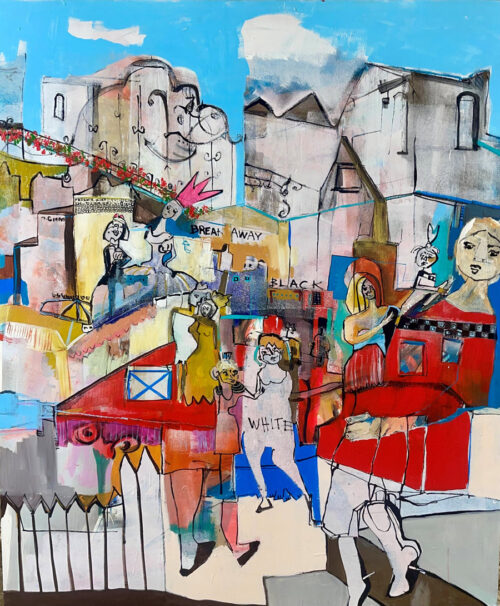 Working primarily on large canvases, her process integrates a wide range of materials including acrylic, oil, charcoal, watercolor, markers, and recycled organic components. Through this layered methodology, her works explore the relationship between material, memory, and the human figure.