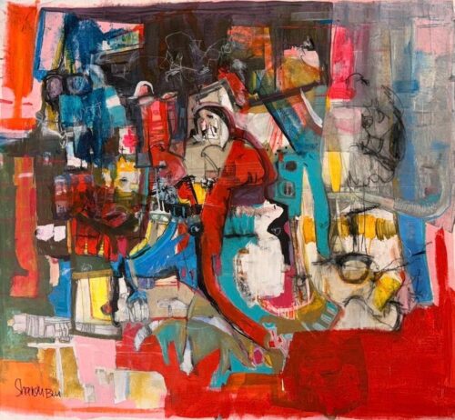 Working primarily on large canvases, her process integrates a wide range of materials including acrylic, oil, charcoal, watercolor, markers, and recycled organic components. Through this layered methodology, her works explore the relationship between material, memory, and the human figure.