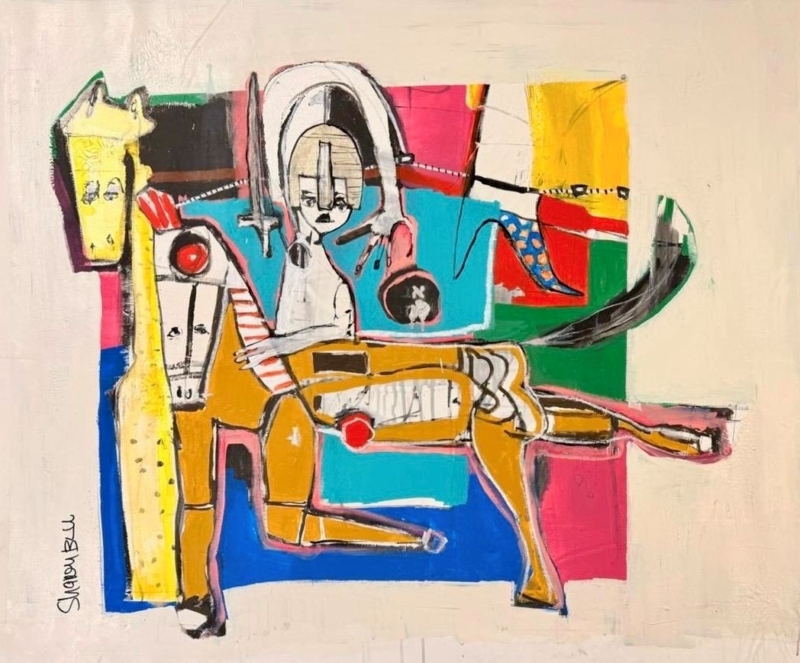 Working primarily on large canvases, her process integrates a wide range of materials including acrylic, oil, charcoal, watercolor, markers, and recycled organic components. Through this layered methodology, her works explore the relationship between material, memory, and the human figure.